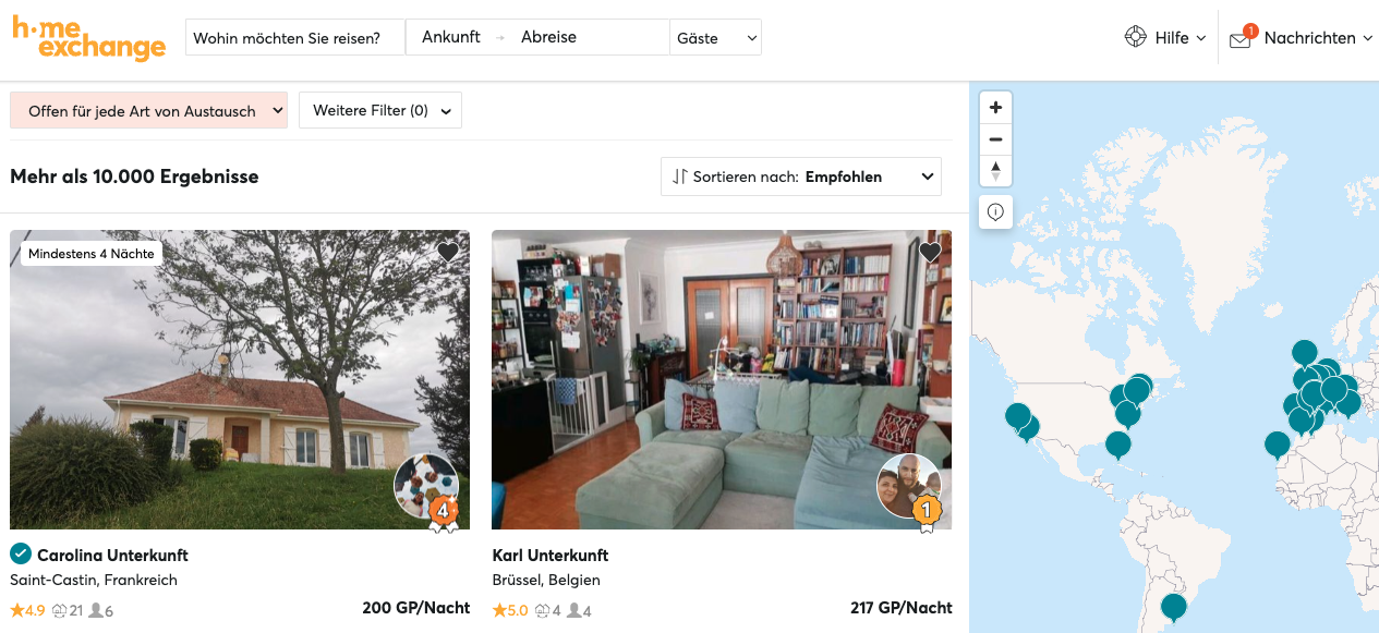 Klicken Sie am oberen linken Bildschirmrand auf "Wohin möchten Sie reisen?", um auf HomeExchange nach einer Unterkunft zu suchen. Geben Sie Ihr Wunschreiseziel ein und drücken Sie "Enter" oder klicken Sie auf die Lupe: